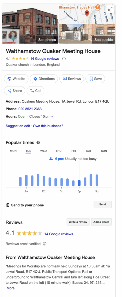 The name includes the area – helpful if you’ve searched for Quaker Meeting House and can see several results and don’t know which you should click on.