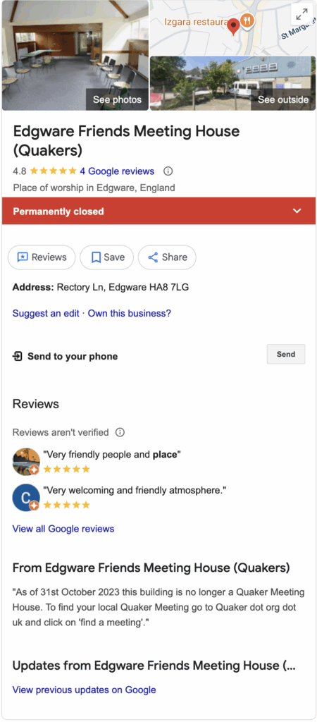 - has closed either permanently as for Edgware (which helpfully sends people to Quaker.org.uk to look for their nearest meeting house,